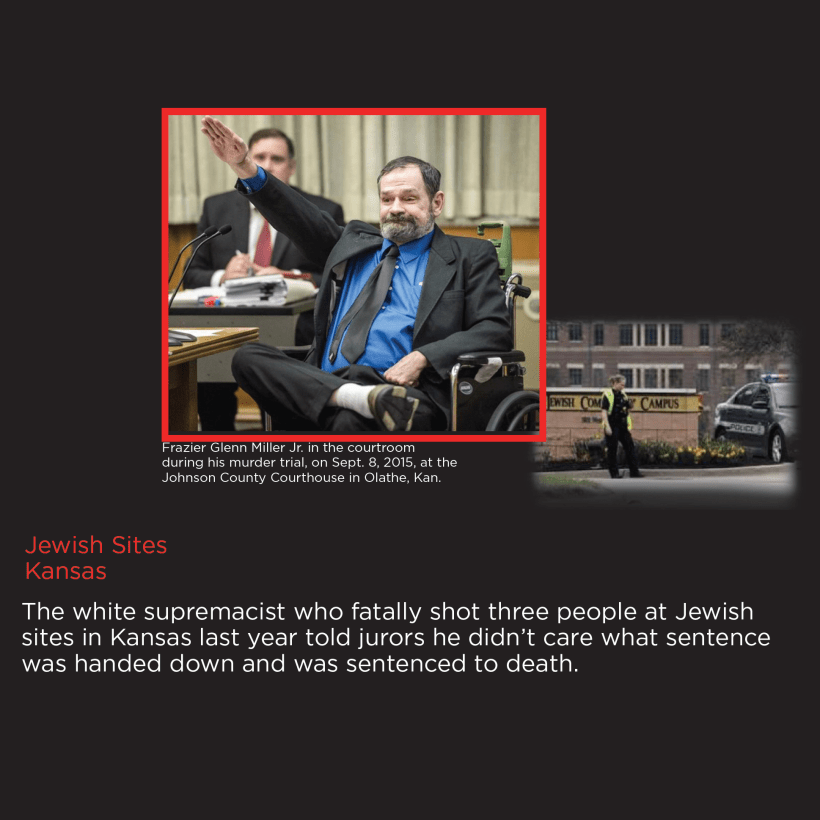 Neo-Nazi and former Ku Klux Klan leader Frazier Miller, Jr., fatally shot Dr. William Corporon and his 14-year-old grandson, Reat Underwood, outside a Jewish center in Overland Park, Kansas, as they arrived for a community event. He then drove to a Jewish retirement community where he fatally shot Terry LaManno, who was visiting her mother. #StopTheHate
