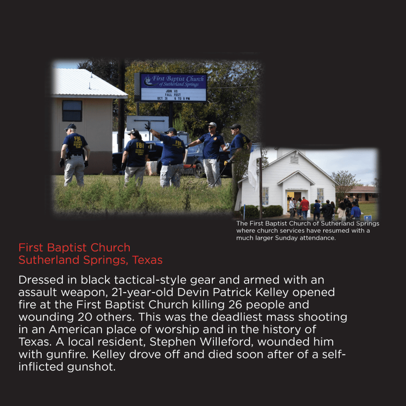 Dressed in black, tactical-style gear and armed with an assault weapon, 21-year-old Devin Patrick Kelley opened fire at the First Baptist Church killing 26 people and wounding 20 others. This was the deadliest mass shooting in an American place of worship and in the history of Texas. A local resident, Stephen Willeford, wounded him with gunfire. Kelley drove off and died soon after of a self-inflicted gunshot. #StopTheHate