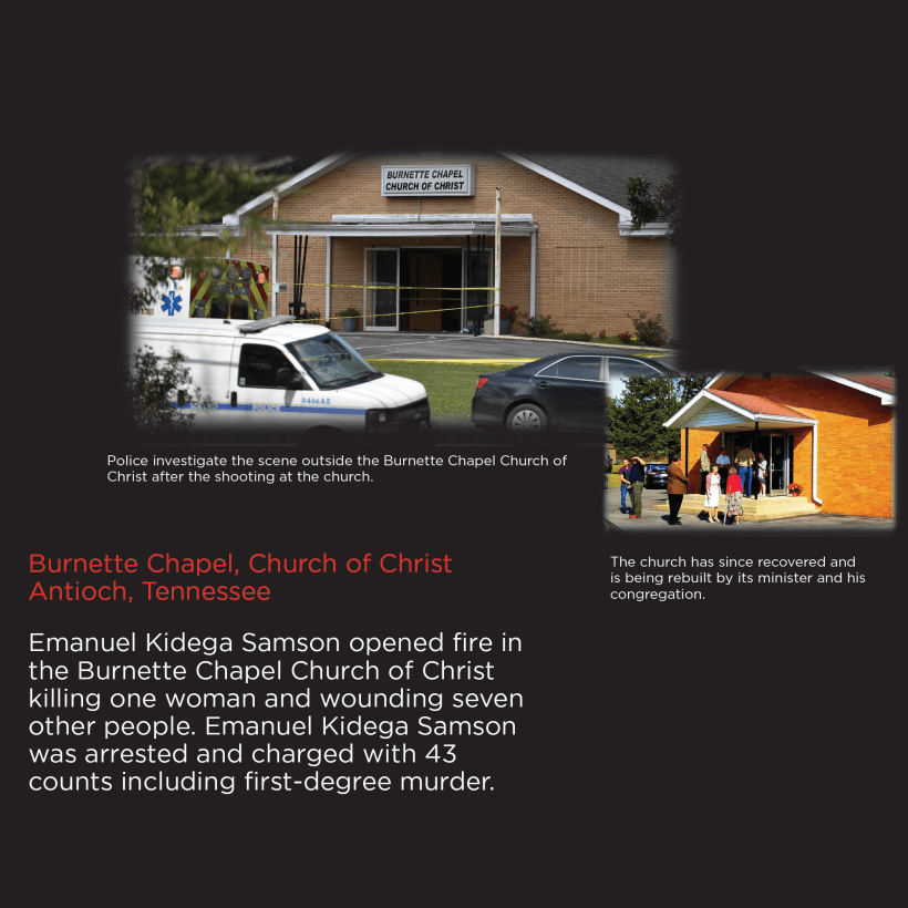 Emanuel Kidega Samson opened fire in the Burnette Chapel Church of Christ in Antioch, Tennessee, killing one woman and wounding seven other people. Emanuel Kidega Samson was arrested and charged with 43 counts including first-degree murder. #StopTheHate
