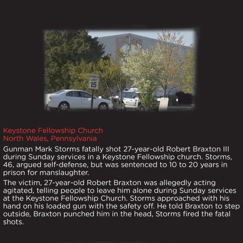 Gunman Mark Storms fatally shot 27-year-old Robert Braxton III during Sunday services in a Keystone Fellowship church. Storms, 46, argued self-defense, but was sentenced to 10 to 20 years in prison for manslaughter. The victim was allegedly acting agitated, telling people to leave him alone during Sunday services at the church. Storms approached with his hand on his loaded gun with the safety off. He told Braxton to step outside, Braxton punched him in the head, and Storms fired the fatal shots.