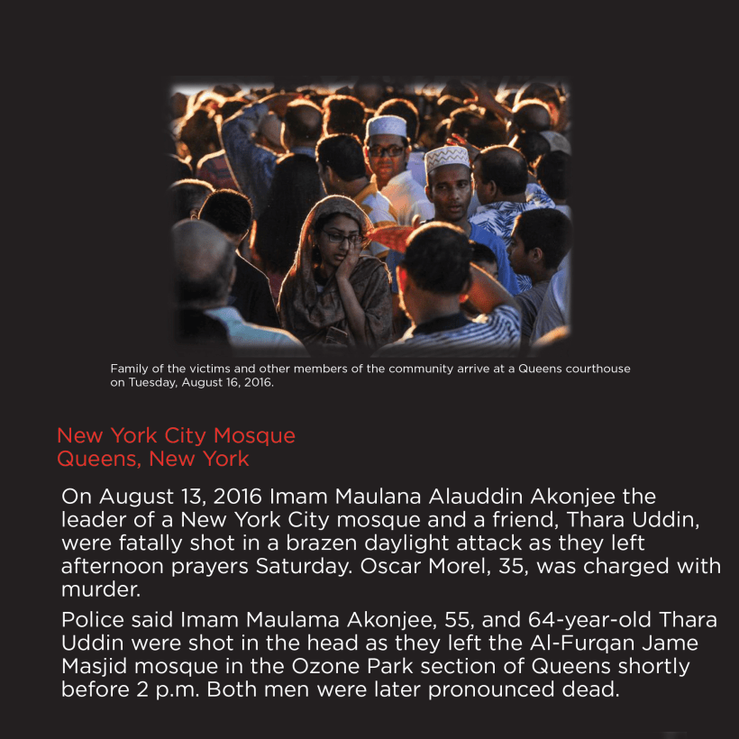 On August 13, 2016, Imam Maulana Alauddin Akonjee, the leader of a New York City mosque, and a friend, Thara Uddin, were fatally shot in a brazen daylight attack as they left Saturday afternoon prayers. Oscar Morel, 35, was charged with murder. Police said Imam Akonjee, 55, and Uddin, 64, were shot in the head as they left the Al-Furqan Jame Masjid mosque in the Ozone Park section of Queens shortly before 2 PM. Both men were later pronounced dead. #StopTheHate